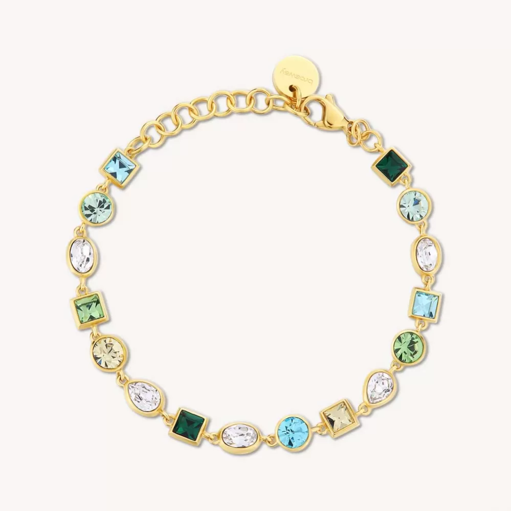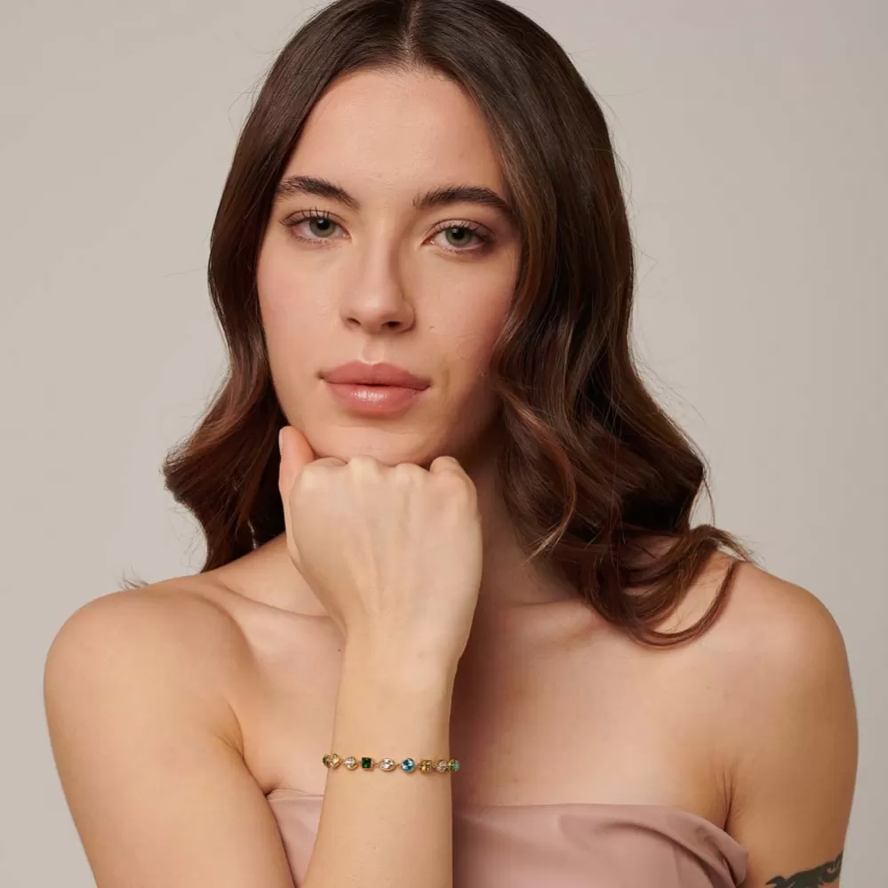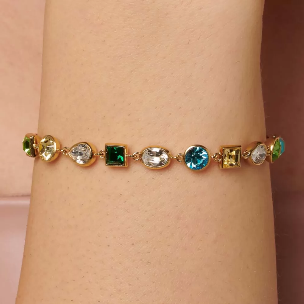 Žiarivý a veľmi luxusný kúsok, ktorý rozžiari zápästie každej žene. Náramok je vyrobený z vysoko kvalitnej ocele a je bohato zdobený Swarovski kryštálmi. Oceľ je opatrená PVD povrchovou úpravou vo farbe žltého zlata. Dĺžka náramku je 15 cm, s využitím retiazky 4 cm, je možné náramok zapnúť v dĺžke 15 až 19 cm. Nastaviteľná dĺžka má úžasnú výhodu v tom, že nemusíte poznať presnú dĺžku náramku a obdarovaná osoba si dĺžku sama upraví podľa vlastných preferencií.