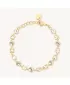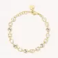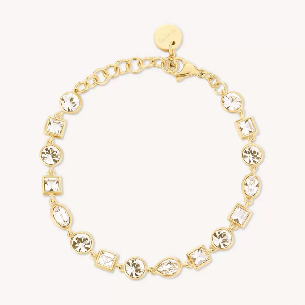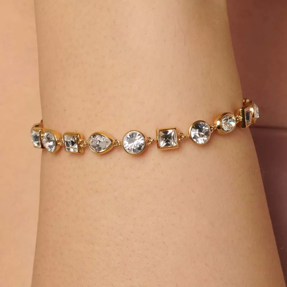 Náramok z vysoko kvalitnej nerezovej ocele, ktorá je opatrená PVD povrchovou úpravou vo farbe žltého zlata. Náramok zdobia prvotriedne kryštály Swarovski v bielej farbe. Dĺžka náramku je 15 cm, s využitím retiazky 4 cm, je možné náramok zapnúť v dĺžke 15 až 19 cm. Nastaviteľná dĺžka má úžasnú výhodu v tom, že nemusíte poznať presnú dĺžku náramku a obdarovaná osoba si dĺžku sama upraví podľa vlastných preferencií. Náramok sa zapína na spoľahlivú karabínu.