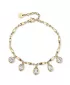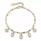 Oslnivý náramok pre ženy je vyrobený z kvalitnej nehrdzavejúcej ocele v lesklom prevedení. Oceľ je upravená PVD povrchovou úpravou vo farbe žltého zlata. Náramok zdobia ozdobné prívesky, ktoré sú osadené kryštálmi Swarovski v bielej farbe. Náramok je veľmi pohodlný a prispôsobí sa každému zápästiu. Tento šperk je proti strate chránený karabínkou.