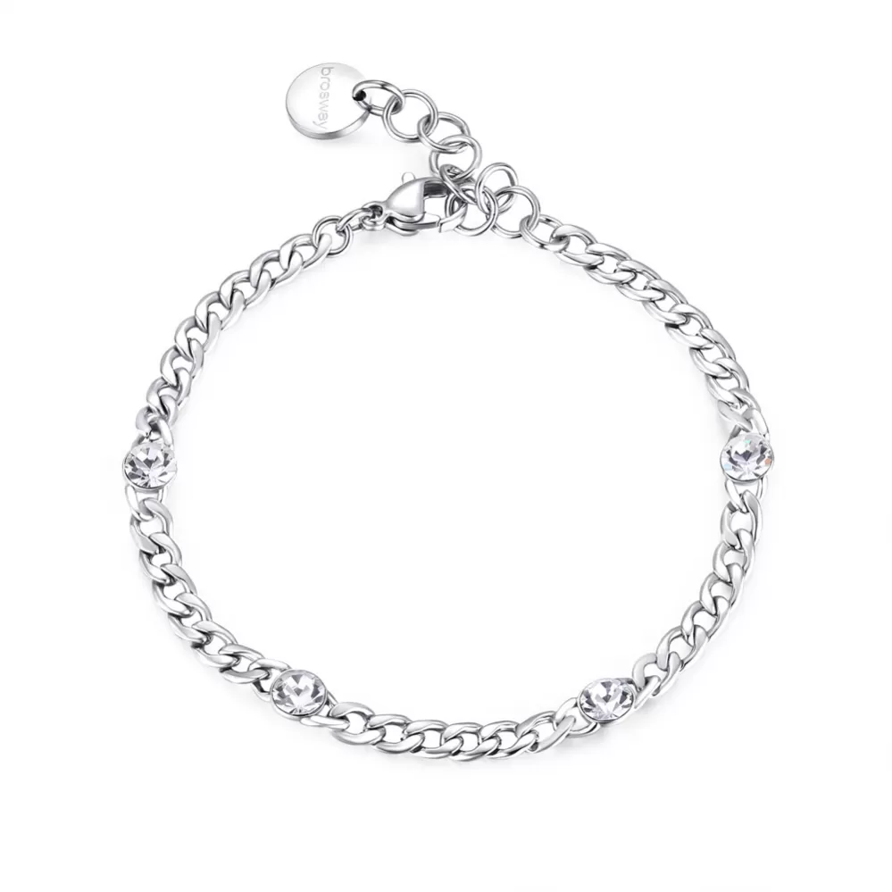 Veľmi elegantný dámsky náramok v jednoduchom dizajne je vyrobený z chirurgickej ocele v lesklej povrchovej úprave. Náramok zdobia Swarovski kryštály. Dĺžka náramku je 15 cm, s využitím retiazky 4 cm, je možné náramok zapnúť v dĺžke 16 až 19 cm. Nastaviteľná dĺžka má úžasnú výhodu v tom, že nemusíte poznať presnú dĺžku náramku a obdarovaná osoba si dĺžku sama upraví podľa vlastných preferencií. Náramok sa zapína na spoľahlivú karabínu.