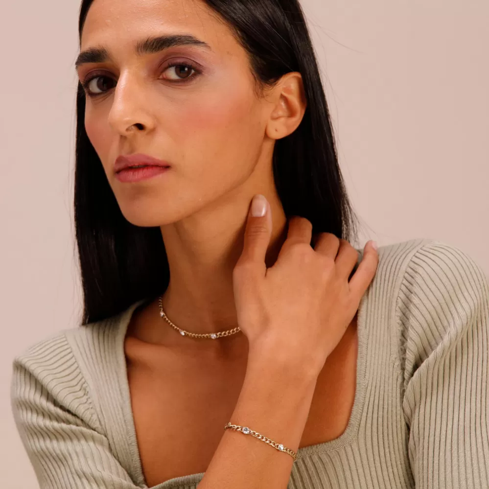 Náramok z vysoko kvalitnej nerezovej ocele, ktorá je opatrená PVD povrchovou úpravou vo farbe žltého zlata. Náramok zdobia prvotriedne kryštály Swarovski v bielej farbe. Dĺžka náramku je 15 cm, s využitím retiazky 4 cm, je možné náramok zapnúť v dĺžke 15 až 19 cm. Nastaviteľná dĺžka má úžasnú výhodu v tom, že nemusíte poznať presnú dĺžku náramku a obdarovaná osoba si dĺžku sama upraví podľa vlastných preferencií. Náramok sa zapína na spoľahlivú karabínu.