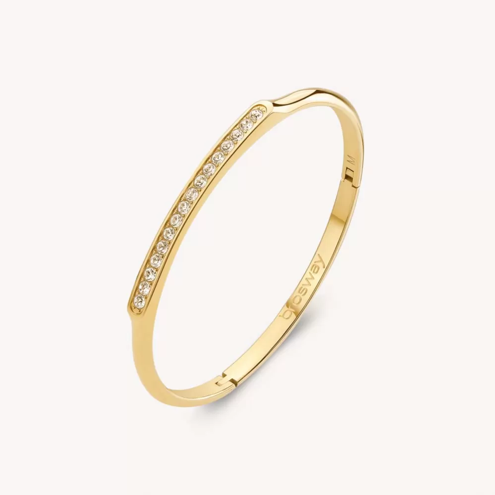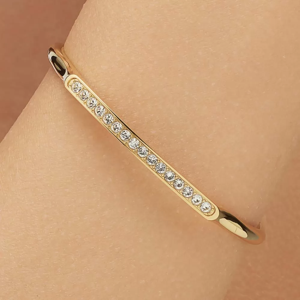 Dámsky náramok je vyrobený z vysoko kvalitnej nerezovej ocele, ktorá je ošetrená PVD povrchovou úpravou vo farbe žltého zlata. Náramok je zdobený Swarovski kryštálmi.
