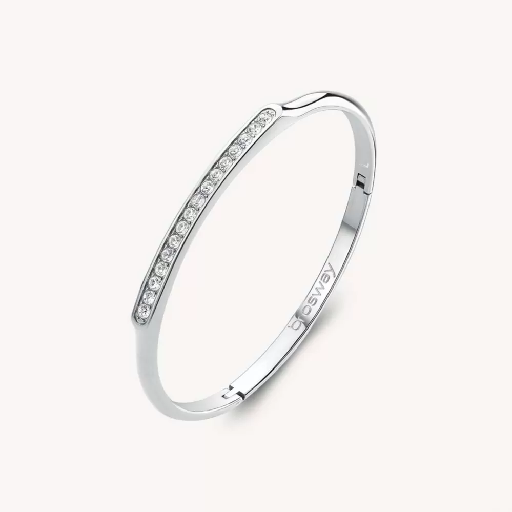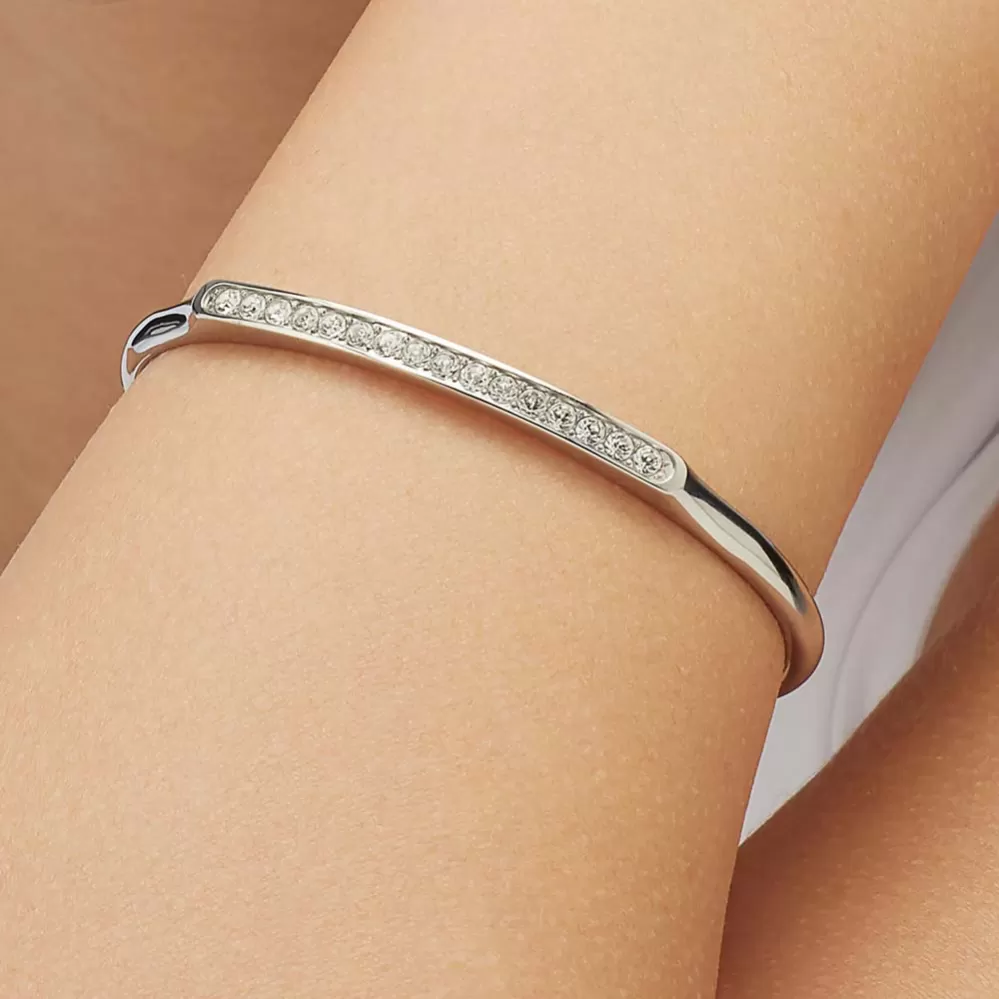 Dámsky náramok je vyrobený z vysoko kvalitnej nerezovej ocele v lesklej povrchovej úprave. Náramok je zdobený Swarovski kryštálmi, ktoré sú precízne vsadené jeden vedľa druhého.