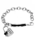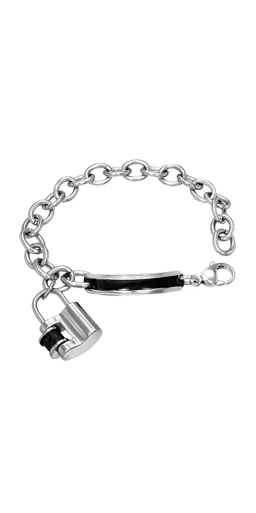 Náramok s doštičkou vyrobený z chirurgickej ocele v lesklej povrchovej úprave, so zapínaním na karabínu.