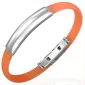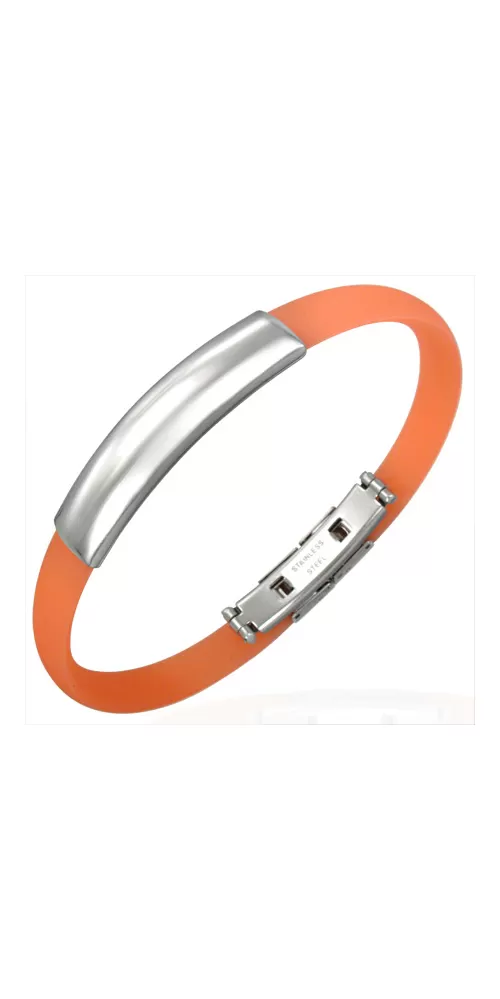Moderný náramok z chirurgickej ocele a kaučuku oranžovej farby s doštičkou uprostred. Doštička a zapínanie je v lesklej povrchovej úprave.