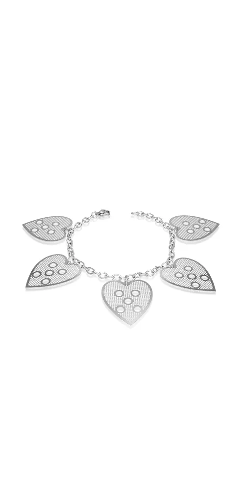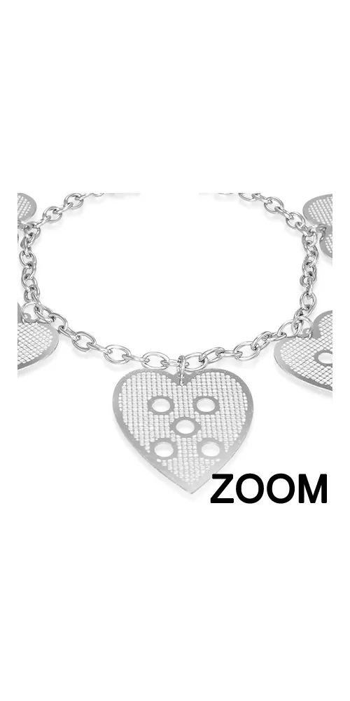 Náramok z chirurgickej ocele je tvorený z ankrovej retiazky s príveskami sŕdc v lesklej povrchovej úprave so zapínaním na karabínku.