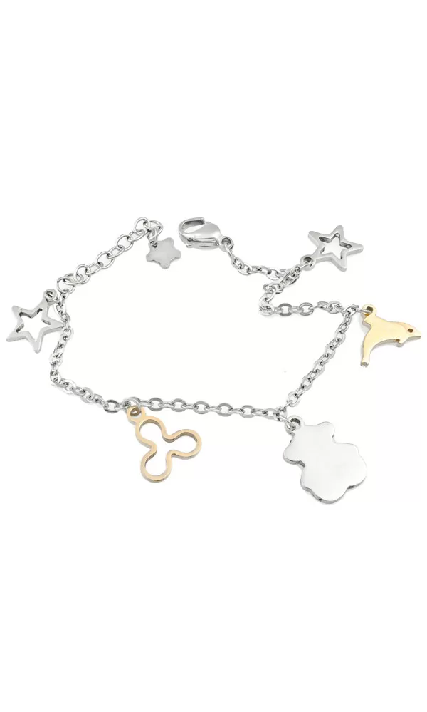 Veľmi pekný náramok je vyrobený z chirurgickej ocele z ankrovej retiazky s rôznymi príveskami. Niektoré prívesky sú silne zaltené pozlátené technologickou PVD a celý náramok je vyrobený v lesklej povrchovej úprave. Náramok sa zapína na karabínku.