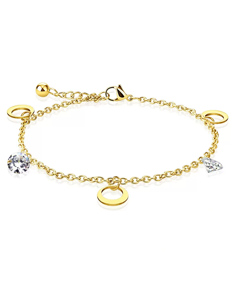Náramok s príveskami je vyrobený z chirurgickej ocele v lesklom prevedení. Prívesky sú v okrúhlom tvare a náramok zdobia aj veľké zirkóny. Oceľ je opatrená PVD povrchovou úpravou vo farbe žltého zlata. Prednosťou zlatenia technológií PVD je vysoká tvrdosť a odolnosť proti oteru! Ide o hrubú vrstvu, ktorá preniká do pôvodného materiálu. Zlatenie technológií PVD sa dá porovnať s približne 12 mikrónmi galvanického zlatenia, čo je vysoká hodnota, ktorá pri bežnom nosení vydrží až 12 rokov. Náramok je tvorený z pevnej retiazky a zapína sa na karabínu.