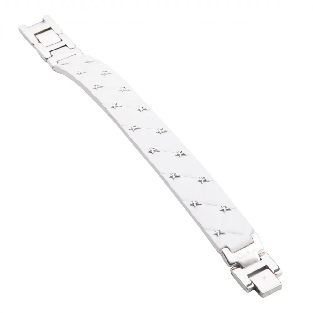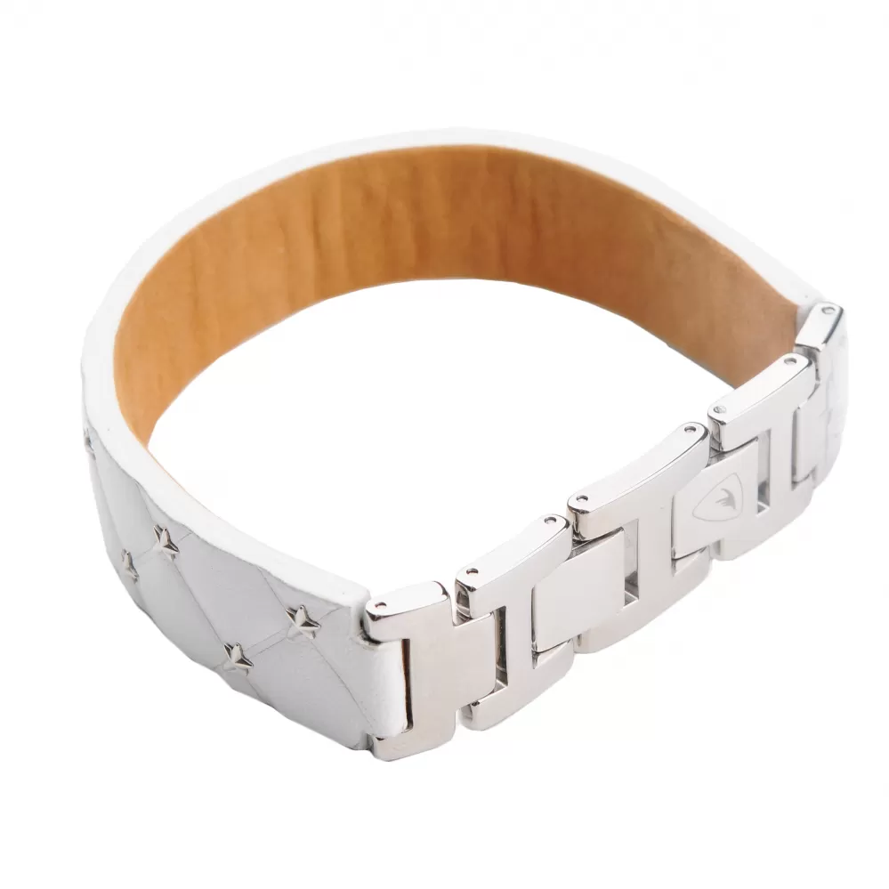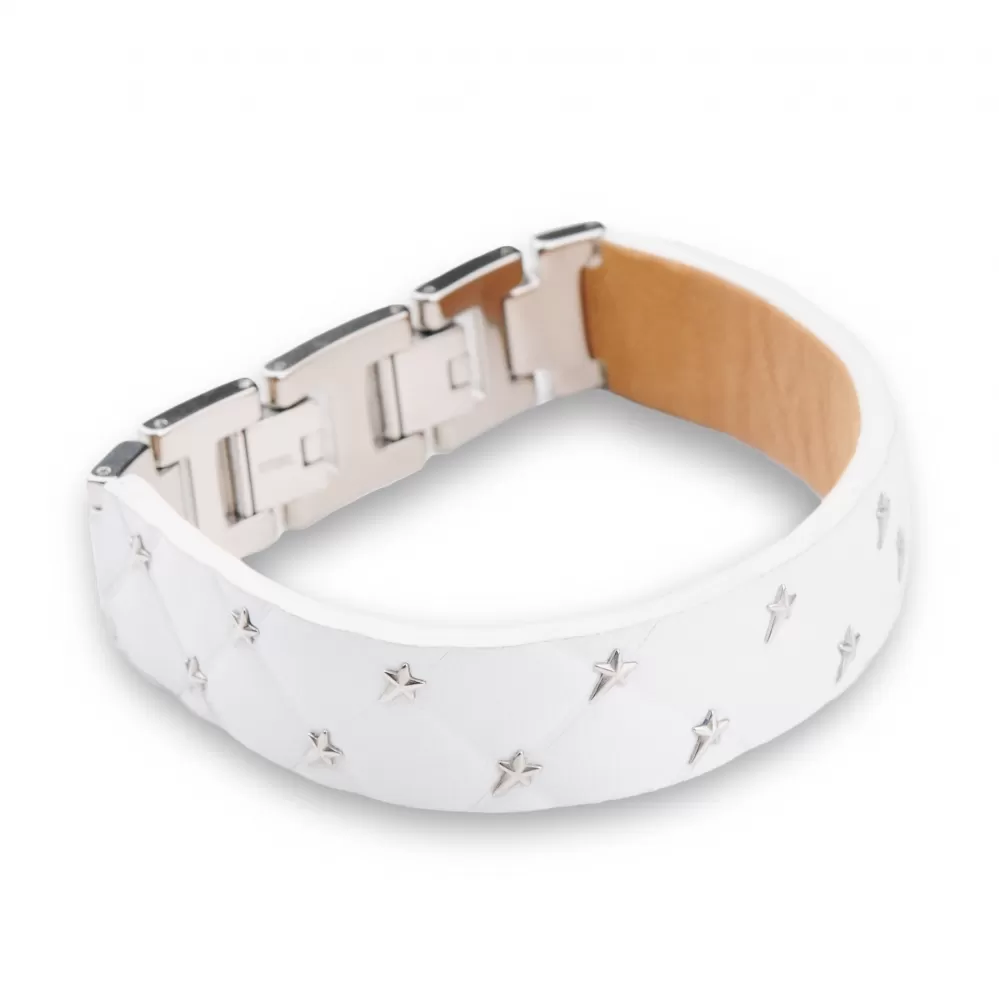 Značka Thierry Mugler sa vyznačuje osobitým a štýlovým prístupom k móde a tiež v oblasti vytvárania šperkov Tento náramok je vyrobený z chirurgickej ocele a po celom svojom obvode je zdobený bielou kožou s drobnými hviezdičkami z ocele v lesklej povrchovej úprave. Chirurgická oceľ sa vyznačuje svojou farebnou stálosťou a tiež tým, že nespôsobuje alergické reakcie. Náramok je možné jednoducho skrátiť pomocou odopínateľného článku v zapínaní.