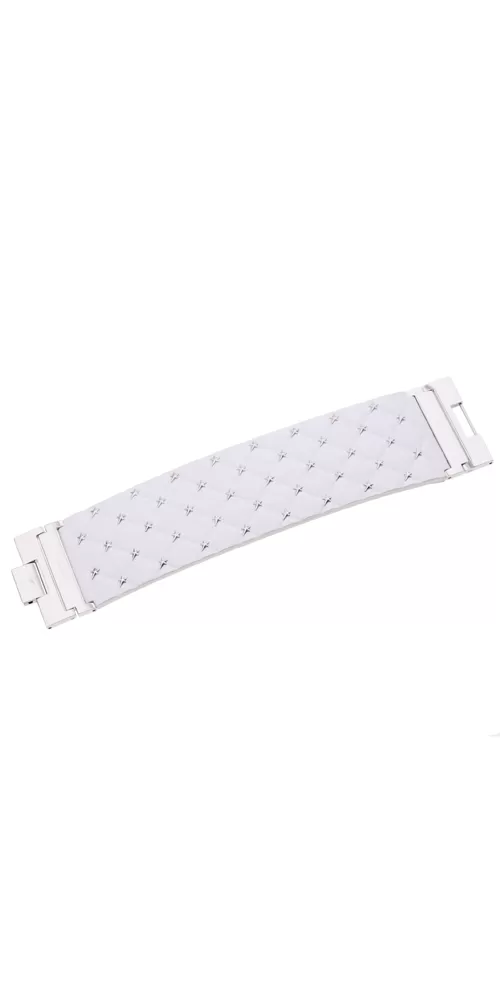 Značka Thierry Mugler sa vyznačuje osobitým a štýlovým prístupom k móde a tiež v oblasti vytvárania šperkov. Tento široký náramok je vyrobený z chirurgickej ocele a po celom svojom obvode je zdobený bielou kožou s drobnými hviezdičkami z ocele v lesklej povrchovej úprave. Chirurgická oceľ sa vyznačuje svojou farebnou stálosťou a tiež tým, že nespôsobuje alergické reakcie. Náramok je možné jednoducho skrátiť pomocou odopínateľného článku v zapínaní.