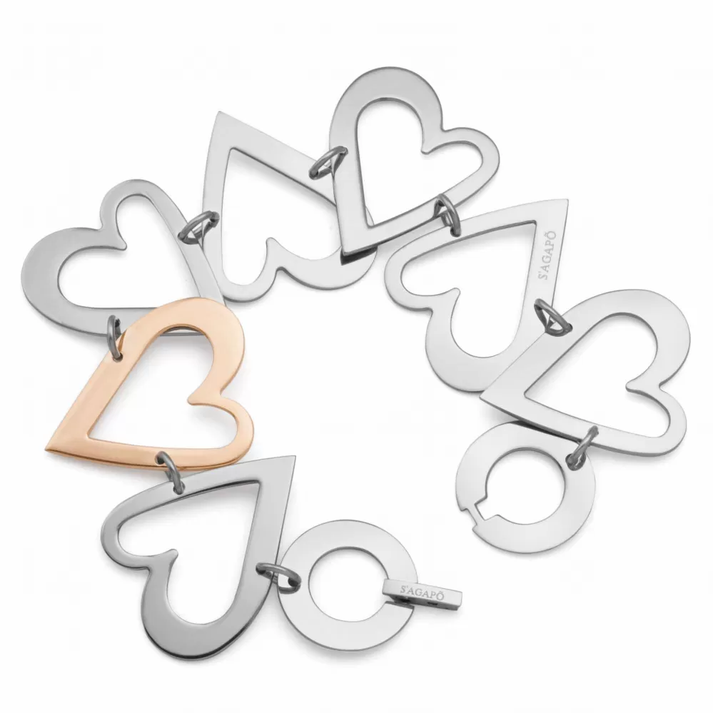 Náramok je tvorený zo sŕdc, ktoré sú spojené malým očkom a je vyrobený z chirurgickej ocele s ružovým pozlátením silnou technológiou PVD v lesklej povrchovej úprave. Na náramku je zobrazená značka Sagapó.