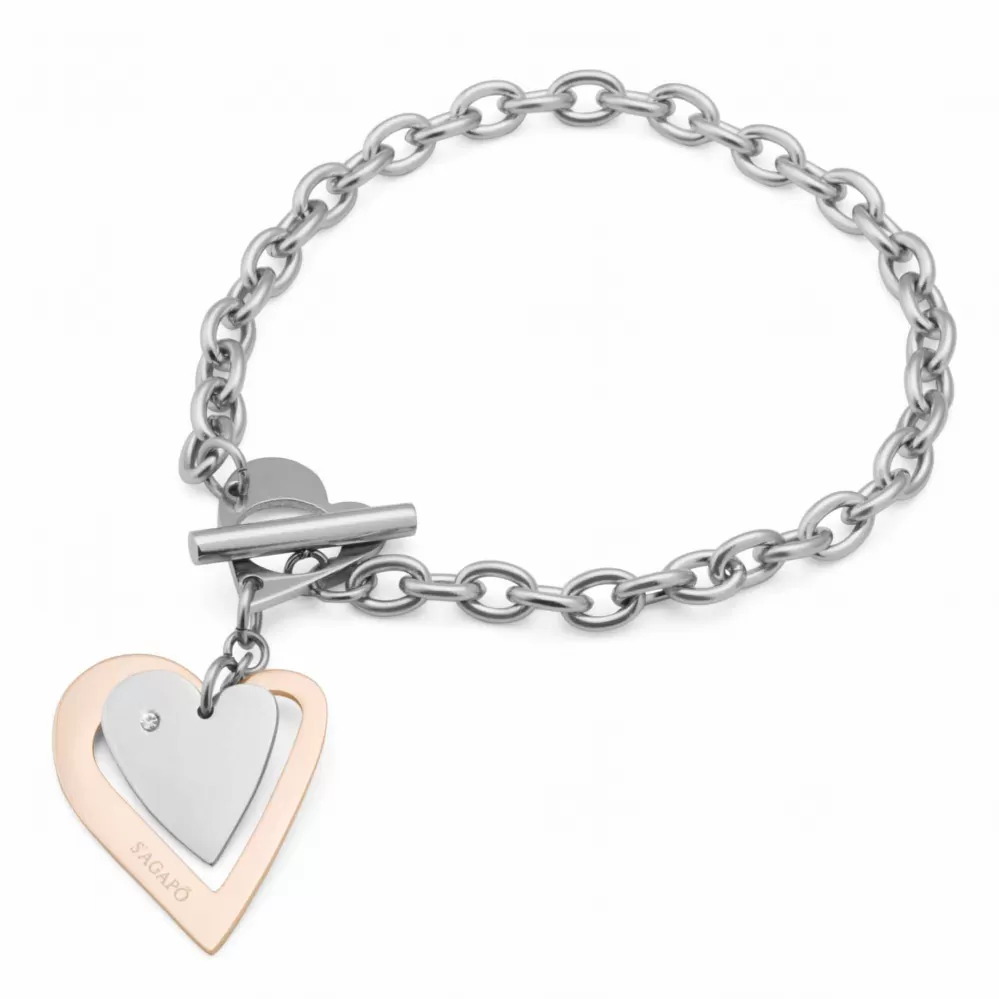 Náramok je vyrobený chirurgickej ocele s príveskami v tvare sŕdc s ružovým pozlátením technológiou PVD v lesklej povrchovej úprave so zapínaním na provlíkací krúžok. Na náramku je zobrazená značka Sagapó.