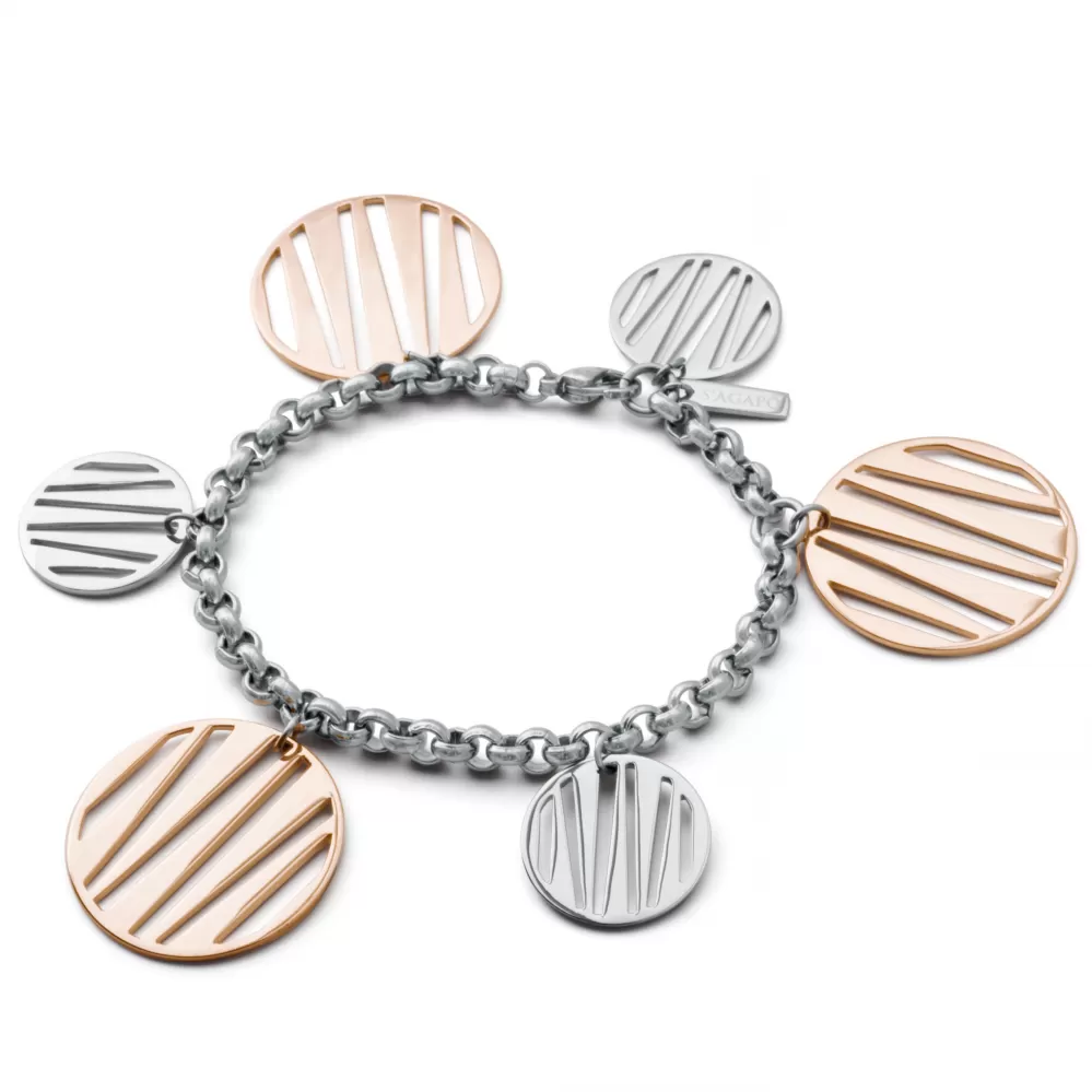Náramok z chirurgickej ocele s príveskami s ružovým pozlátením silnou technológiou PVD v lesklej povrchovej úprave. Náramok sa zapína na karabínku. Na náramku je zobrazená značka Sagapó.