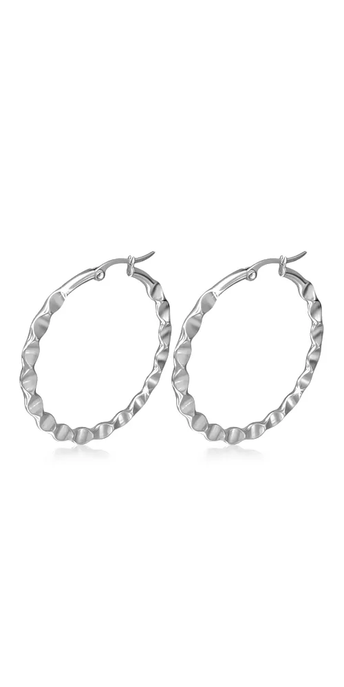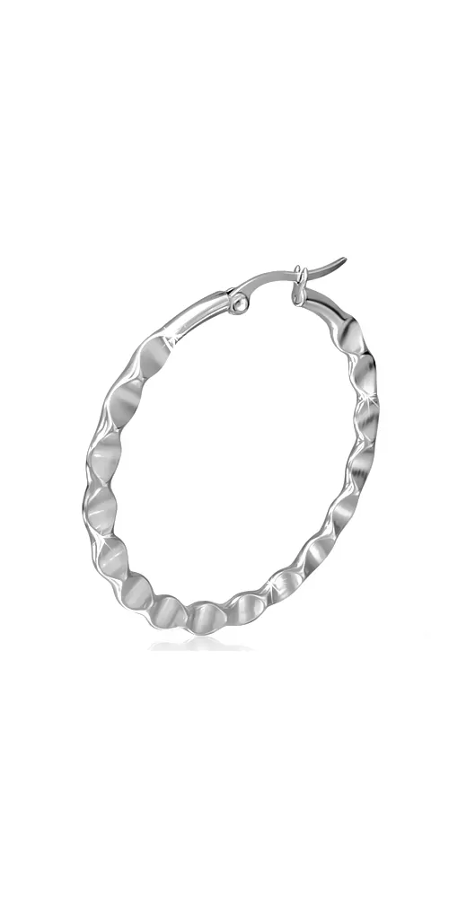 Krásne dámske náušnice v tvare kruhu z chirurgickej ocele v lesklej povrchovej úprave. Náušnice Vás zaujmú svojim prevedením. Sú po celej dĺžke zvlnené.