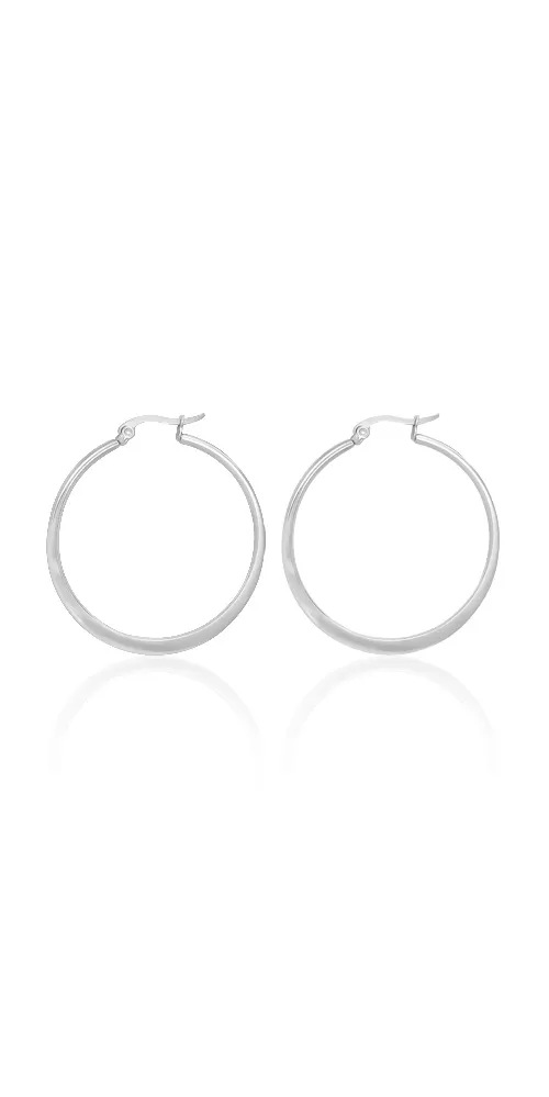 Veľké módne kruhy z chirurgickej ocele v lesklej povrchovej prave s priemerom 45mm. Kruhy stále patria medzi najobľúbenejšie náušnice. Tieto kruhy sú na spodnej časti rozšírené.