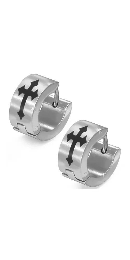 Náušnice vyrobené z chirurgickej ocele  v matnej povrchovej úprave. Náušnice sa otvárajú a zatvárajú pomocou pántu na dve polovice. Náušnice sú z prednej strany zdobené krížom v čiernej farbe.