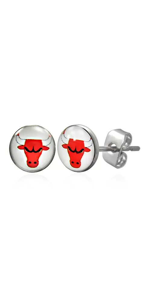 Náušnice kôstky sú vyrobené z chirurgickej ocele so zapínaním na puzety v lesklej povrchovej úprave. Motív na náušničkách je červená hlava býka na bielom pozadí.
