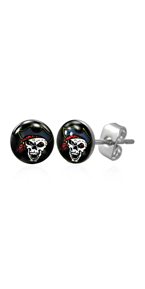Pecky - pirát sú vyrobené z chirurgickej ocele so zapínaním na puzety v lesklej povrchovej úprave. Motív na náušničkách je v štýle čierneho pozadia s pirátskou lebkou.