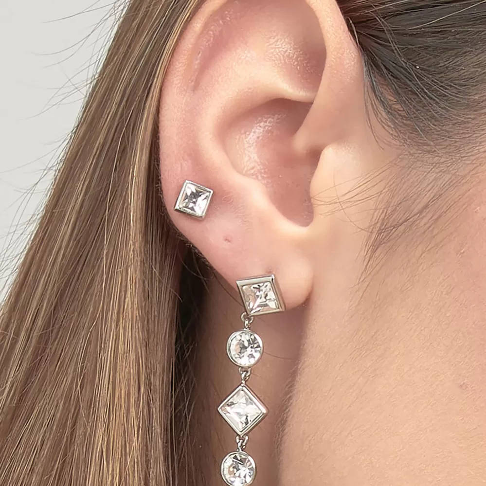 Decentné kôstky štvorcového tvaru sú vyrobené z kvalitnej nerezovej ocele v lesklej povrchovej úprave. Náušnice zdobia dokonalý precízne brúsený Swarovski kryštál, ktorý svojim ligotom priťahuje pozornosť okolia. Náušnice sú vhodné nosiť samostatne ale tiež ich ľahko zladíte s ostatnými náušnicami. Tento model dámskych náušníc sa zapína na puzety.