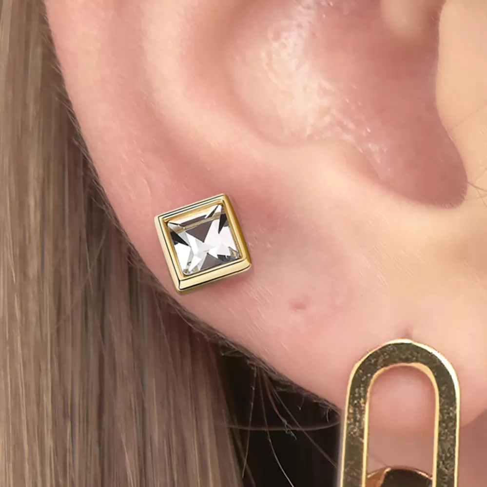 Decentné kôstky štvorcového tvaru sú vyrobené z kvalitnej nerezovej ocele v lesklej povrchovej úprave. Oceľ je ošetrená PVD povrchovou úpravou vo farbe žltého zlata. Náušnice zdobia dokonalý precízne brúsený Swarovski kryštál, ktorý svojim ligotom priťahuje pozornosť okolia. Náušnice sú vhodné nosiť samostatne ale tiež ich ľahko zladíte s ostatnými náušnicami. Tento model dámskych náušníc sa zapína na puzety.