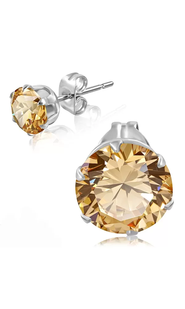 Krásne náušnice z chirurgickej ocele zdobia hnedý veľký zirkón. Tieto decentné náušnice sú vhodné do spoločnosti aj na každodenné nosenie. Náušnice sa zapínajú na puzetku.