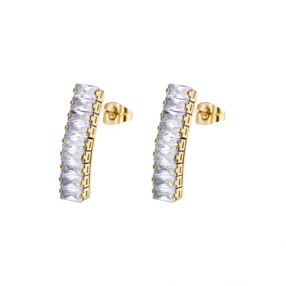 Luxusné visiace náušnice sú vyrobené z nerezovej ocele, ktorá je ošetrená PVD povrchovou úpravou vo farbe žltého zlata. Náušnice sú zdobené precízne vsadenými Swarovski kryštálmi, ktoré sa rozžiaria každým Vaším pohybom.