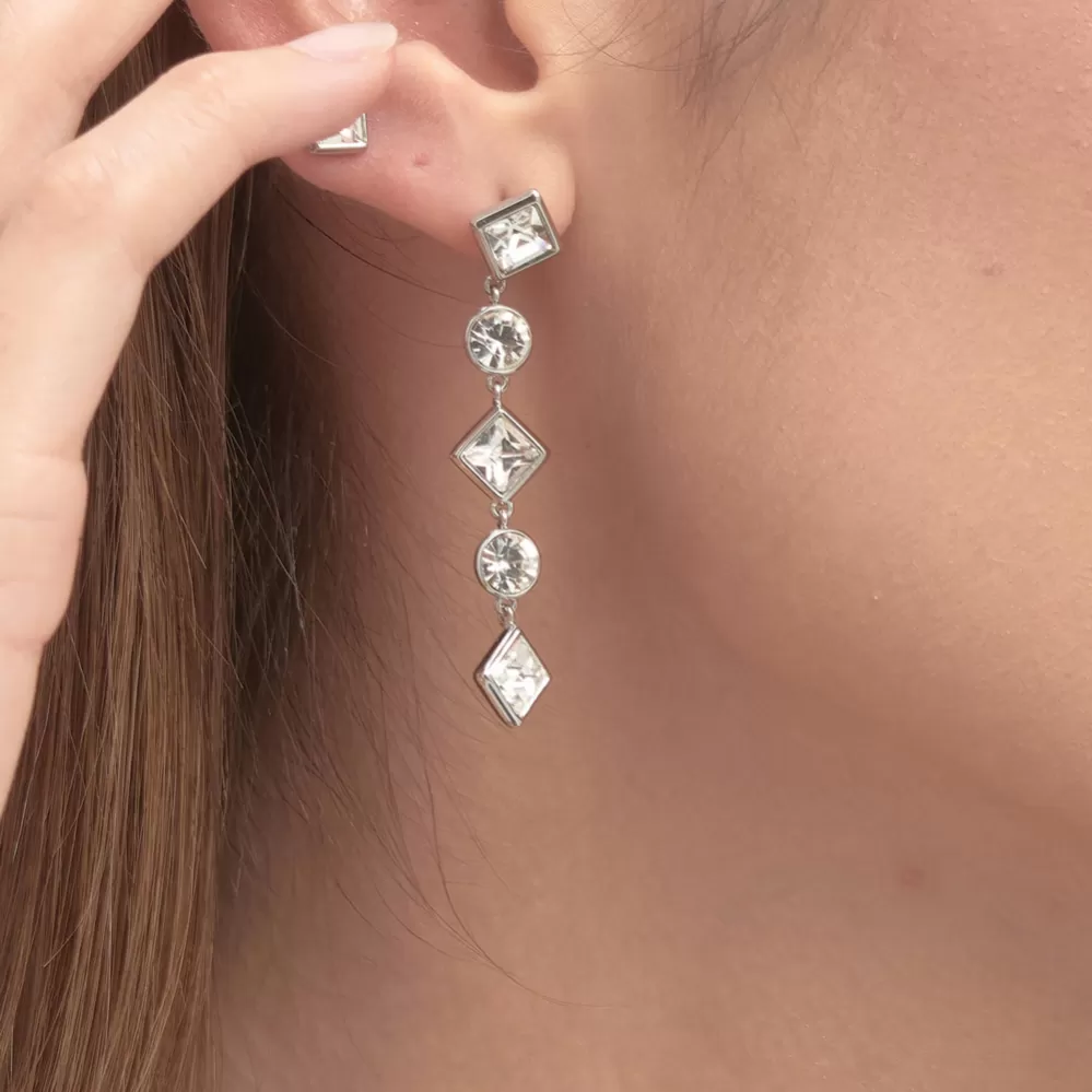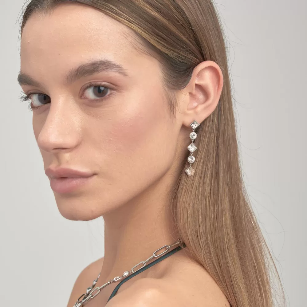 Spoločenské visiace náušnice sú vyrobené z kvalitnej ušľachtilej nerezovej ocele. Náušnice sú zdobené prvotriednymi Swarovski kryštálmi, ktoré sú vsadené do prívesku. Náušnice sa zapínajú na puzety.