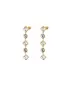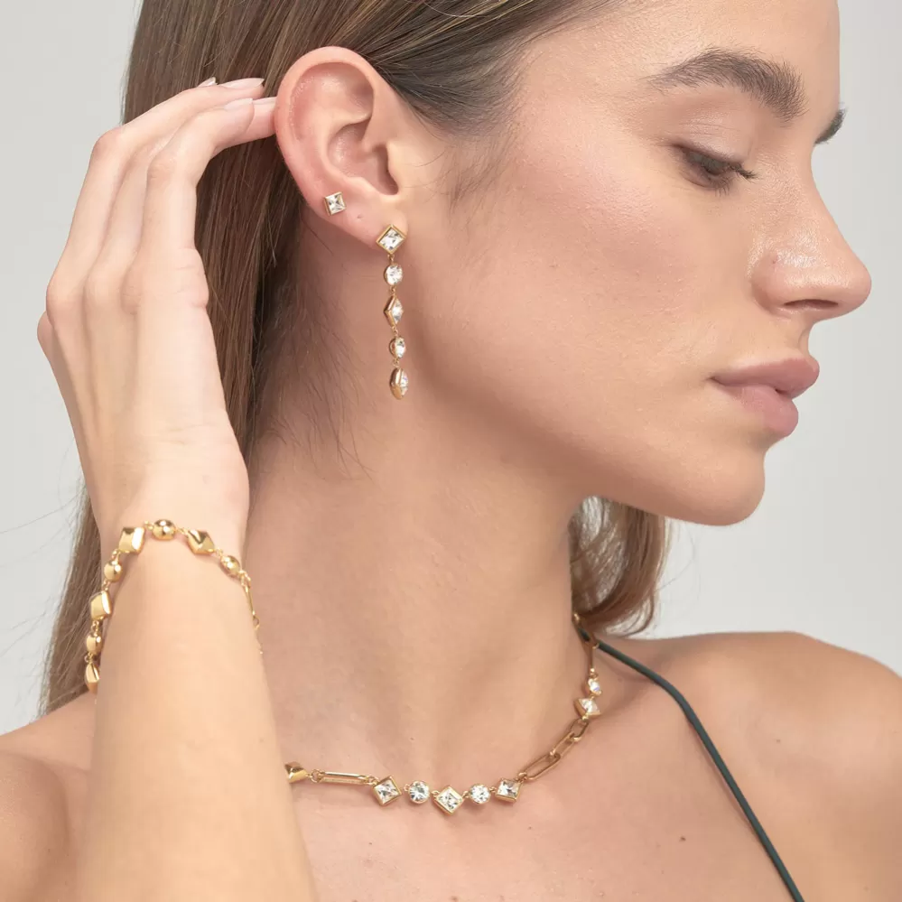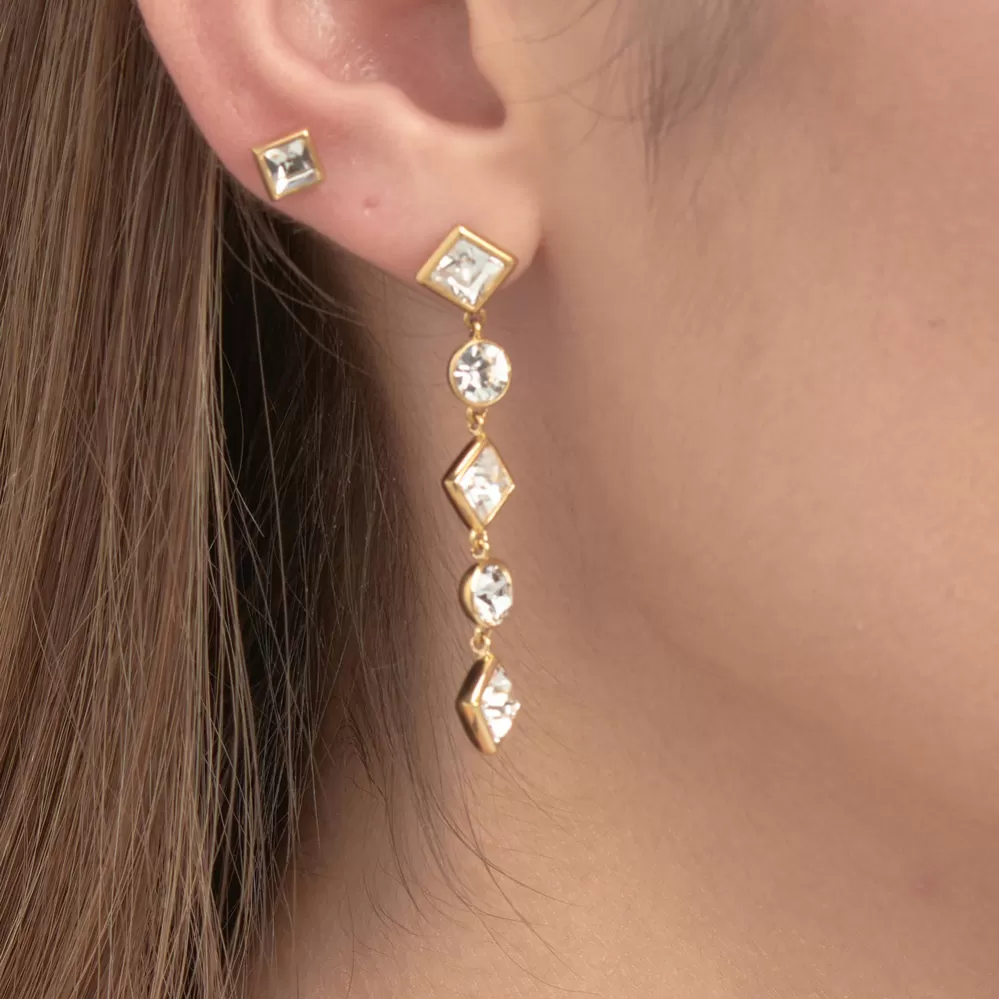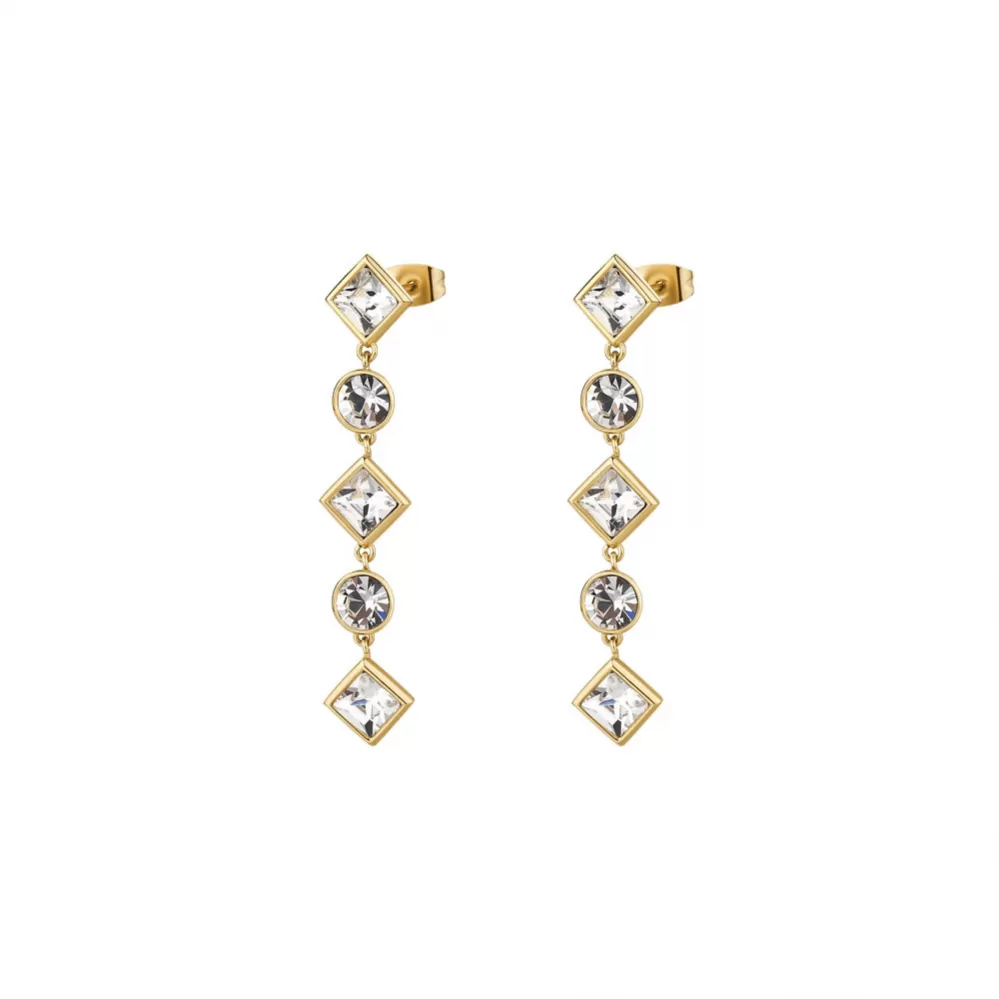 Spoločenské visiace náušnice sú vyrobené z kvalitnej ušľachtilej nerezovej ocele, ktorá je ošetrená PVD povrchovou úpravou vo farbe žltého zlata. Náušnice sú zdobené prvotriednymi Swarovski kryštálmi, ktoré sú vsadené do prívesku. Náušnice sa zapínajú na puzety.