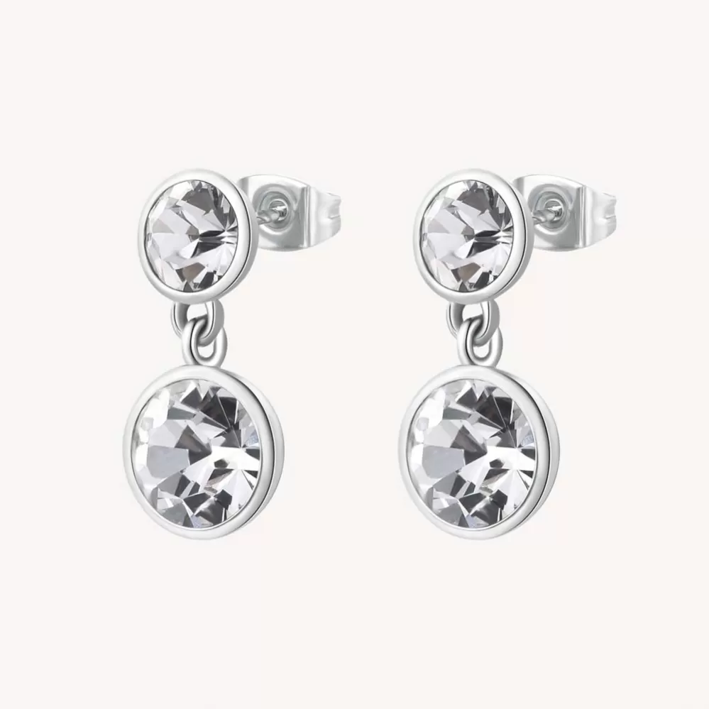 Ozdobte sa žiarivými náušnicami, ktoré nikto neprehliadne. Náušnice sú vyrobené z vysoko kvalitnej nerezovej ocele so zapínaním na puzety. Visiace náušnice zdobia dva okrúhle Swarovski kryštály, ktoré rozžiarite každým Vašim pohybom. Trblietanie a lesk kryštálov si zamilujete.