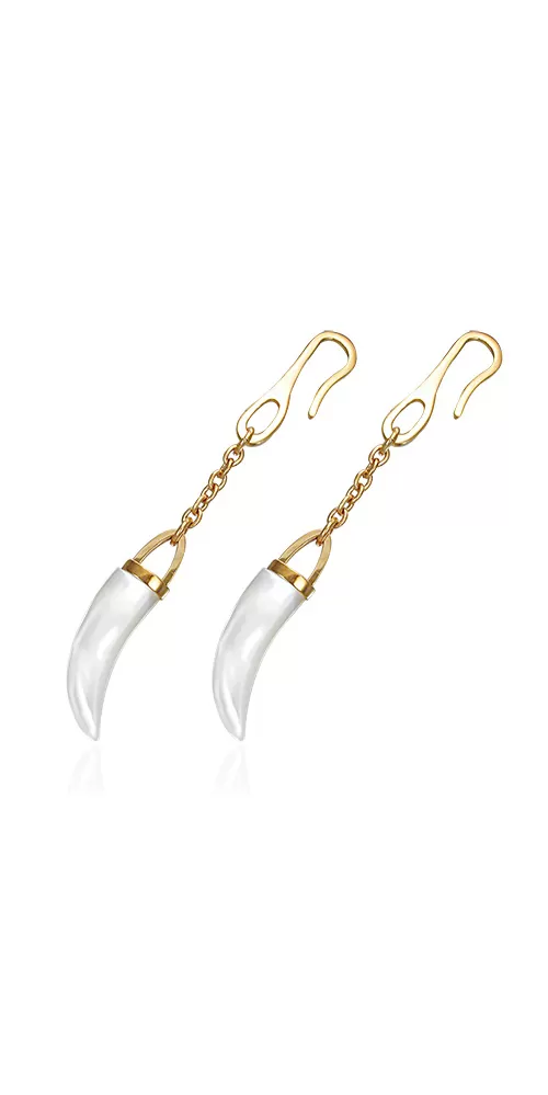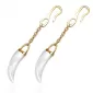 Visiace náušnice s príveskom perleťového zuba sú vyrobené z chirurgickej ocele so silným pozlátením technológií PVD v lesklej povrchovej úprave.