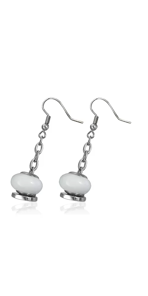 Oceľové náušnice sú tvorené retiazkou na ktorej je voľne navlečená biela oválna korálka. Náušnice sú v lesklej povrchovej úprave.