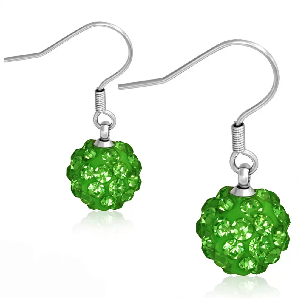 Visiace náušnice so žiarivými kryštálmi v zelenej farbe vyrobenej z chirurgickej ocele v lesklej povrchovej úprave. Náušnice sa Vám budú hodiť na každú príležitosť. Zapínanie náušníc je na háčik.