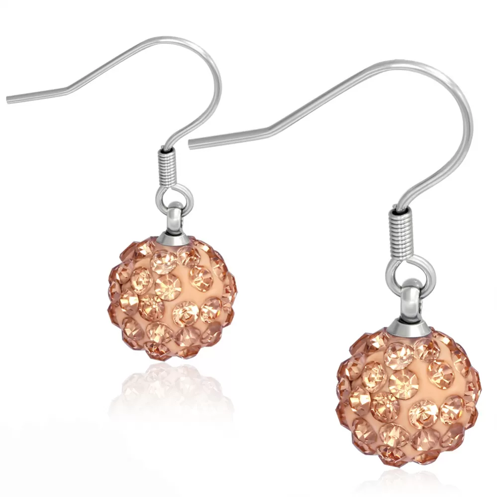 Visiace náušnice so žiarivými kryštálmi v hnedej farbe vyrobenej z chirurgickej ocele v lesklej povrchovej úprave. Náušnice sa Vám budú hodiť na každú príležitosť. Zapínanie náušníc je na háčik.