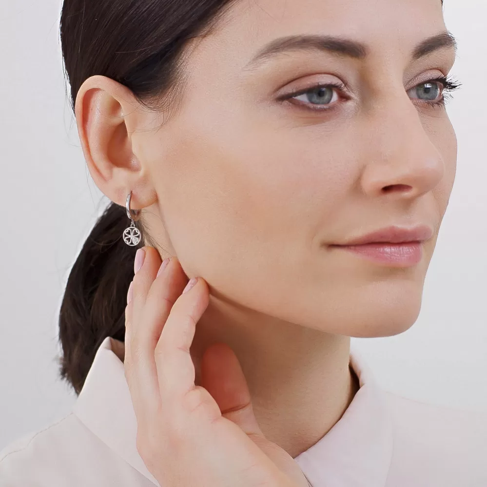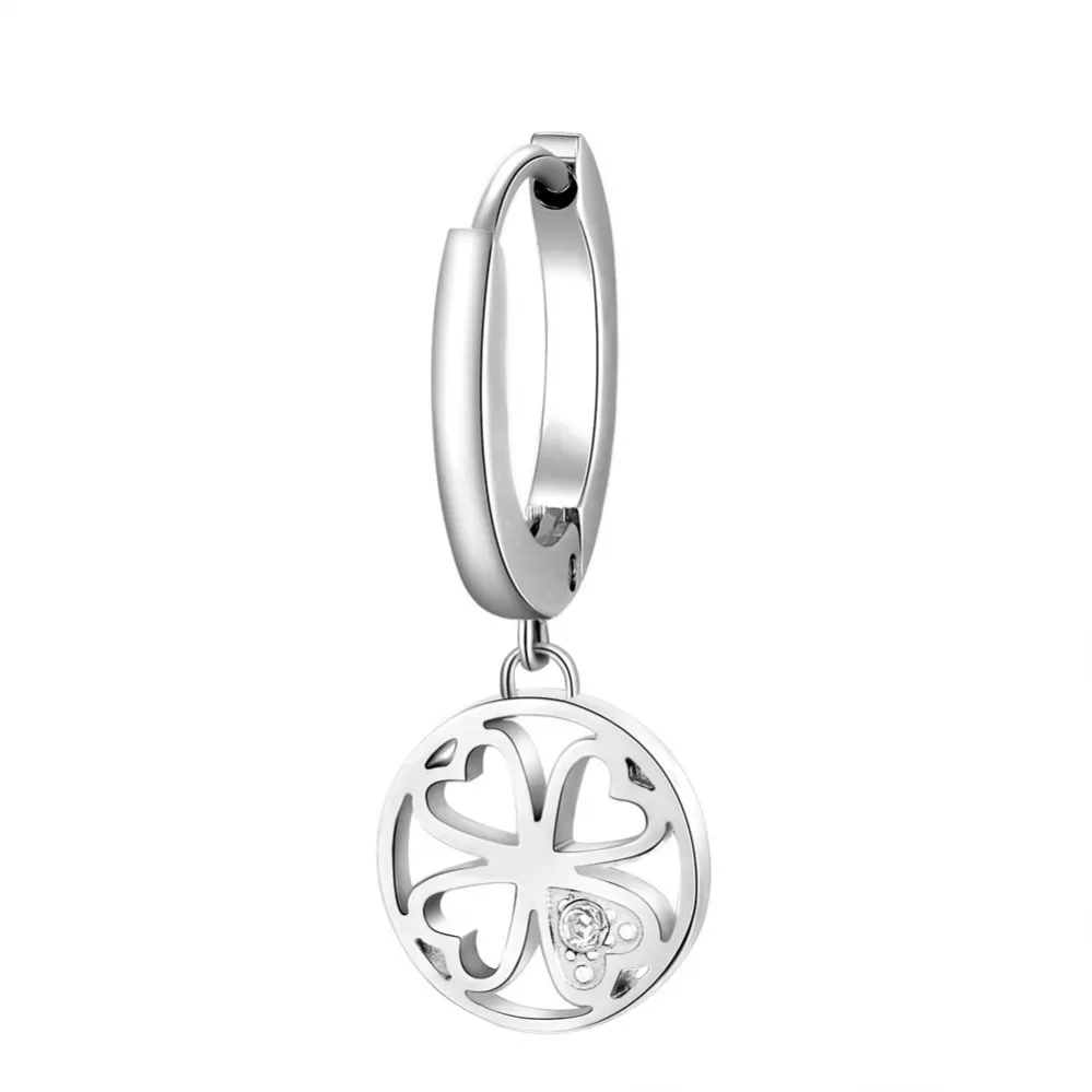 Nový trend medzi náušnicami sú náušnice, ktoré sa predávajú po len kuse. Tento model vo forme krúžku a prívesku je vyrobený z kvalitnej ušľachtilej ocele. Náušnica je zdobená prvotriednymi Swarovski kryštálmi, ktoré sú precízne vsadené prívesku, ktorý vyobrazuje list štvorlístka.