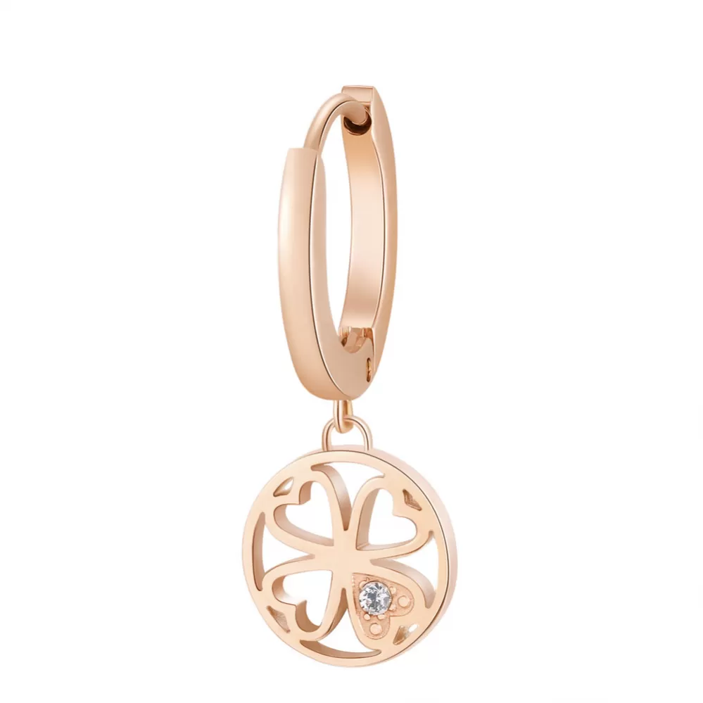 Nový trend medzi náušnicami sú náušnice, ktoré sa predávajú po len kuse. Tento model vo forme krúžku a prívesku je vyrobený z kvalitnej ušľachtilej ocele, ktorá ošetrená PVD povrchovou úpravou vo farbe ružového zlata. Náušnica je zdobená prvotriednymi Swarovski kryštálmi, ktoré sú precízne vsadené prívesku, ktorý vyobrazuje list štvorlístka.