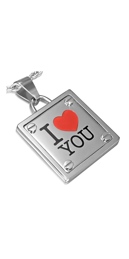 Prívesok - doštička štvorcového tvaru s nápisom I <3 you je vyrobená z chirurgickej ocele. Doštička je z jednej strany lesklá a z druhej strany matná povchová úprava. Na zadnú stranu doštičky si môžete nechať vyryť napr. meno, dátum či venovanie. Príveskom s rytinou zaručene potešíte svojich najbližších.