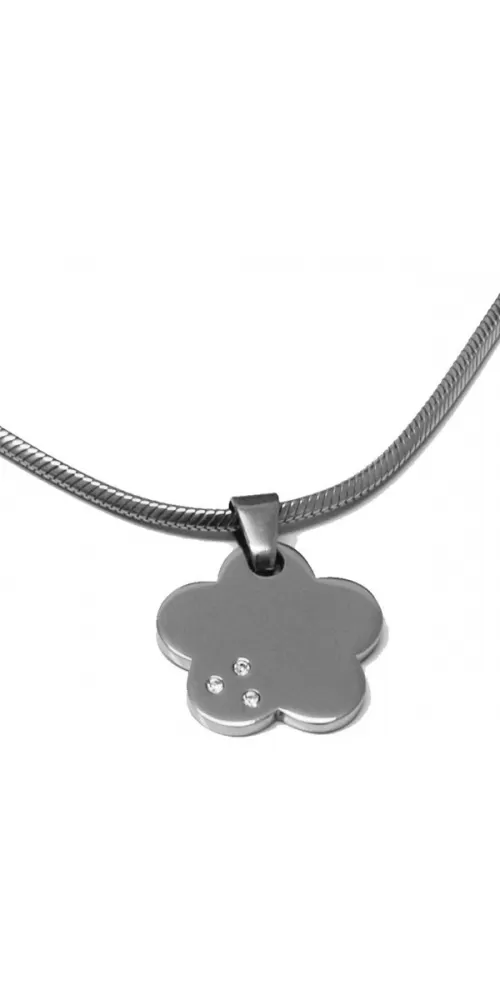Elegantný prívesok z chirurgickej ocele v tvare kvety, s tromi malými okrúhlymi zirkónmi. Lesklá povrchová úprava.