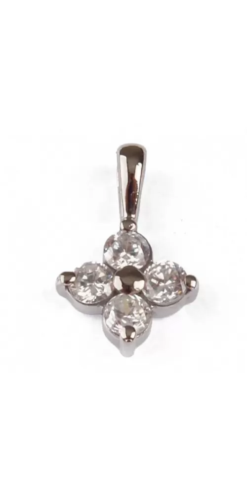 Veľmi pekný menší moderný prívesok z chirurgickej ocele  v lesklej povrchovej úprave v tvare kvietku vyplnený štyrmi bielymi okrúhlymi zirkónmi.