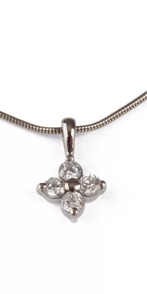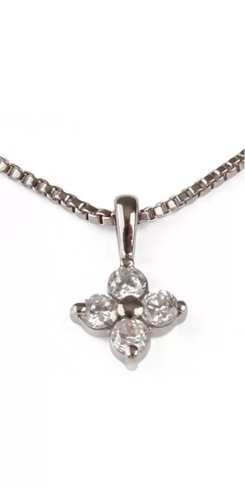 Veľmi pekný menší moderný prívesok z chirurgickej ocele  v lesklej povrchovej úprave v tvare kvietku vyplnený štyrmi bielymi okrúhlymi zirkónmi. Na… Celý popis