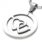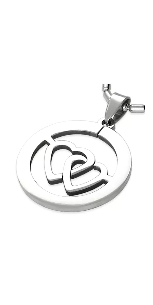 Okrúhly prívesok s dvoma do seba zapletenými srdcami uprostred je vyrobený z chirurgickej ocele, ktorá vyniká svojou farebnou stálosťou a nespôsobuje alergické reakcie. Prívesok je vyrobený v lesklej povrchovej úprave.