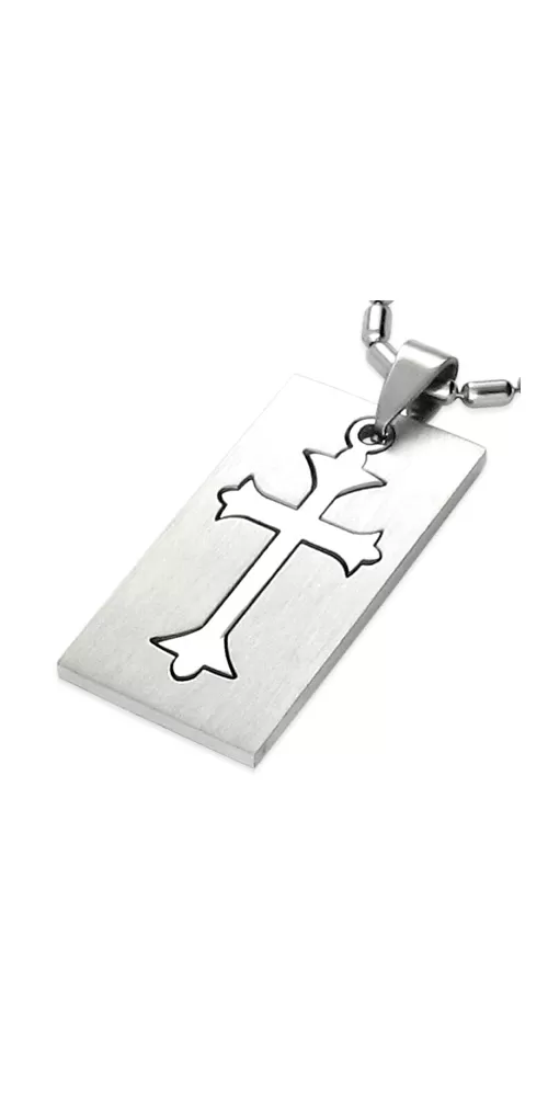 Prívesok - doštička s krížom z chirurgickej ocele v kombinácii lesklej a matnej povrchovej úpravy.