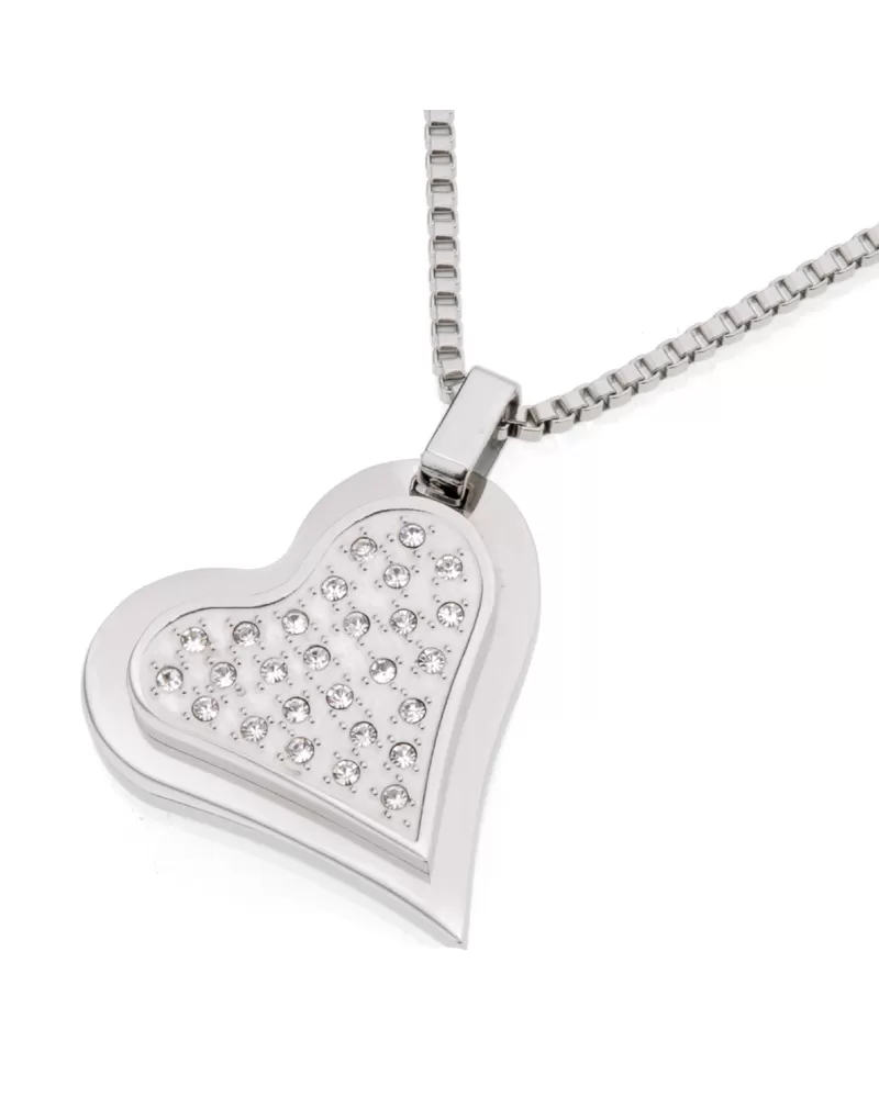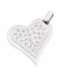 Väčší oceľový prívesok v tvare srdca posádzaný bielymi zirkónmi. Prívesok je vyrobený z chirurgickej ocele v lesklej povrchovej úprave.