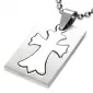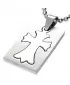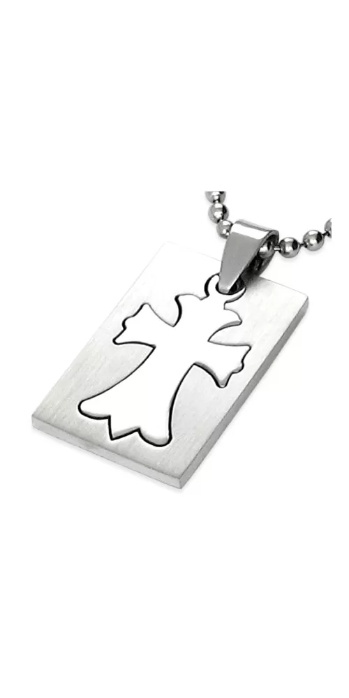 Prívesok - doštička s krížom vyrobený z chirurgickej ocele v kombinácii lesklej a matnej povrchovej úpravy.
