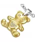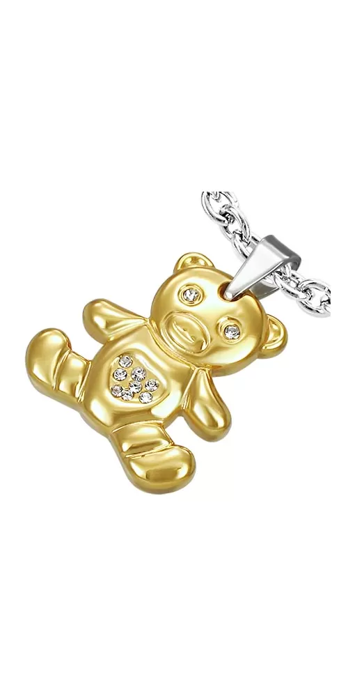 Prívesok z chirurgickej ocele so zlátením silnou technológiou PVD v tvare medvedíka v lesklej povrchovej úprave doplnený dosťmi okrúhlymi bielymi zirkónmi.