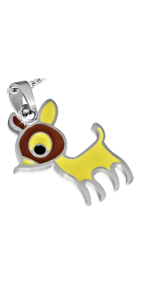 Prívesok v tvare kolouška je vyrobený z chirurgickej ocele v kombinácii s hnedou a žltou barovou v lesklej povrchovej úprave. K prívesku je vhodné použiť retiazku o max. priemere 2,50 mm.