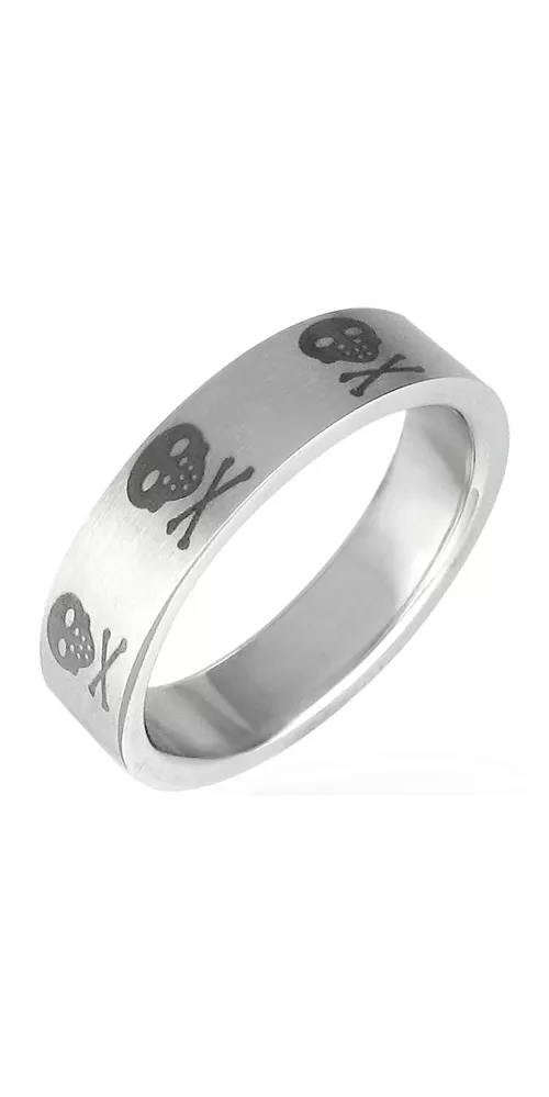 Prsteň rovného profilu je zhotovený z chirurgickej ocele a je ozdobený lebkami po celom svojom obvode. Prsteň je vyrobený v matnej povrchovej úprave.… Celý popis