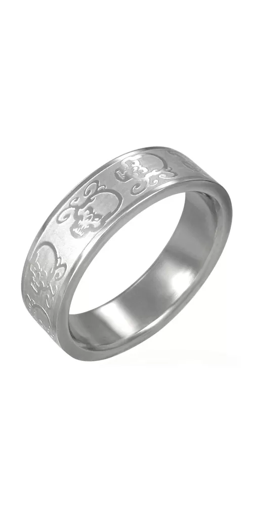Prsteň z chirurgickej ocele je ozdobený plastickými lebkami. Prsteň je zhotovený v kombinácii lesklej a matnej povrchovej úpravy.
