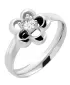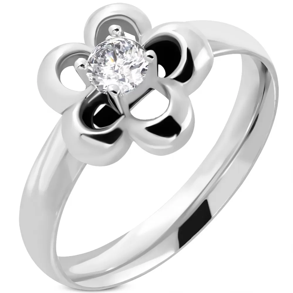 Krásny dámsky prsteň v tvare kvietky z chirurgickej ocele zdobí žiarivý zirkón o veľkosti 4,00 mm. Výhodou toho prsteňa je, že zirkón je v šperku zafasovaný - drží ho okolitý materiál a nie je lepený ako to býva u obvykle lacnejších oceľových šperkov.