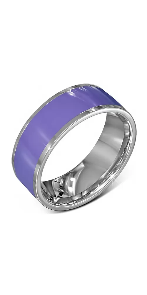 Módny dámsky prsteň je vyrobený z chirurgickej ocele v lesklej povrchovej úprave. Prsteň je zvýraznený fialovým pruhom okolo celého obvodu prsteňa.