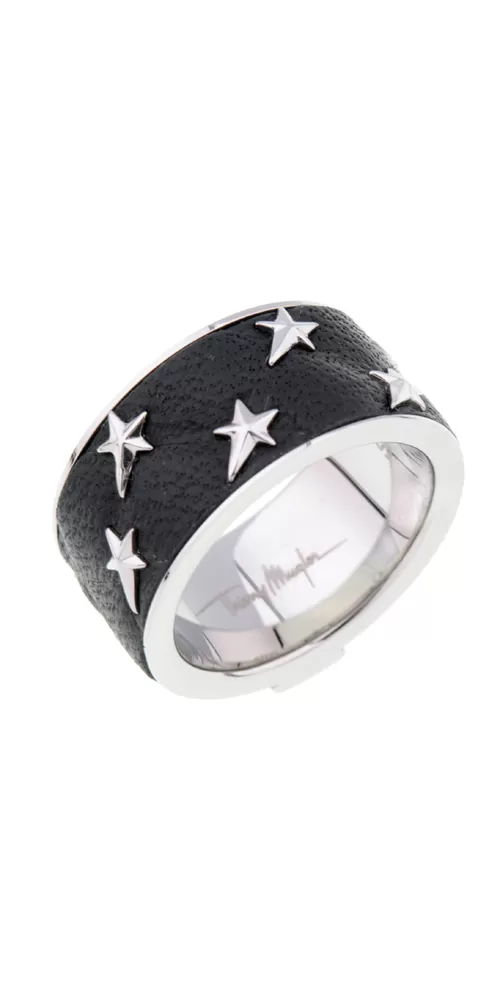 Značka Thierry Mugler sa vyznačuje osobitým a štýlovým prístupom k móde a tiež v oblasti vytvárania šperkov. Tento prsteň je vyrobený z chirurgickej ocele a po celom svojom obvode je zdobený čiernou kožou s drobnými hviezdičkami z ocele v lesklej povrchovej úprave. Chirurgická oceľ sa vyznačuje svojou farebnou stálosťou a tiež tým, že nespôsobuje alergické reakcie.